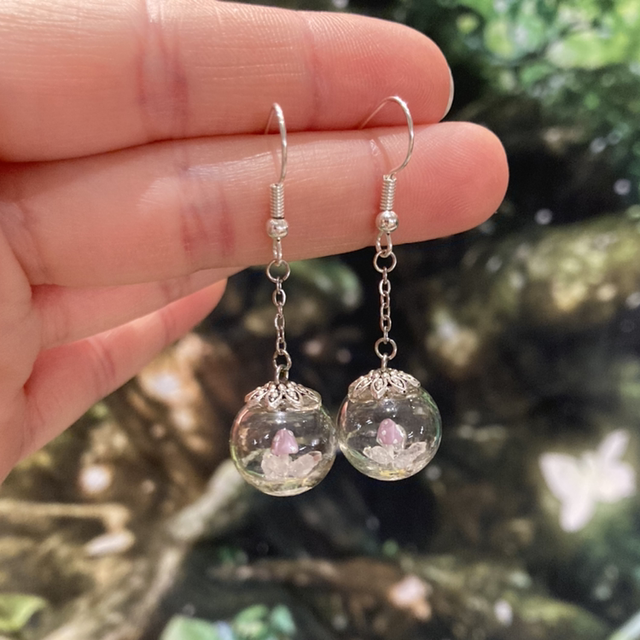 Bijou boucles d'oreilles inspirés de la nature avec des champignons miniatures sculptées à la main, dans une bulle de verre et cabochon en métal argenté.