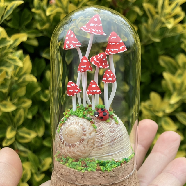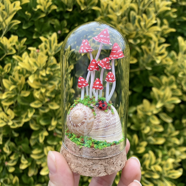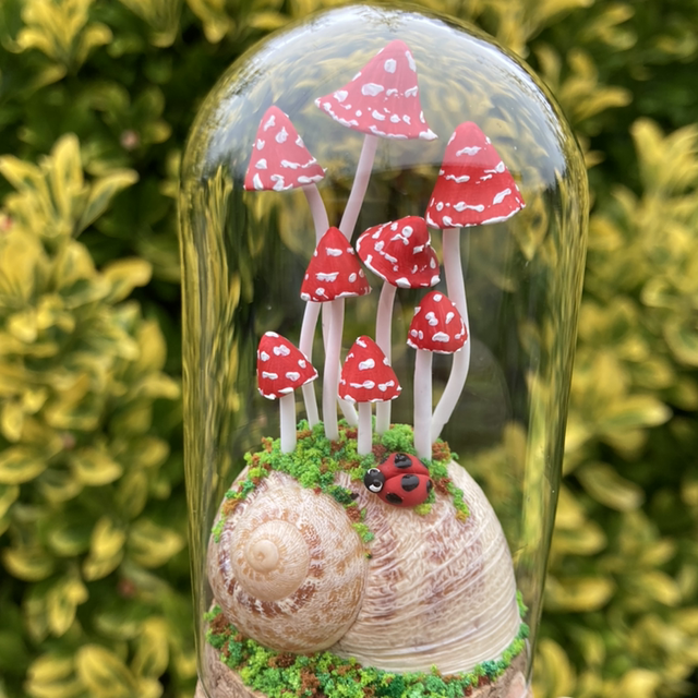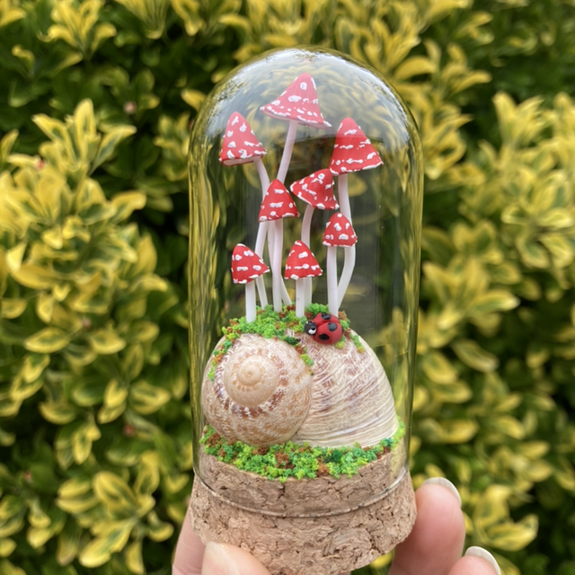 Composition forestière associant des champignons et autres fantaisies sculptées à de véritables éléments naturels, ici sur une véritable coquille d’escargot, protégés dans un bocal ou sous un dôme en verre.