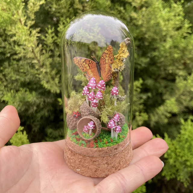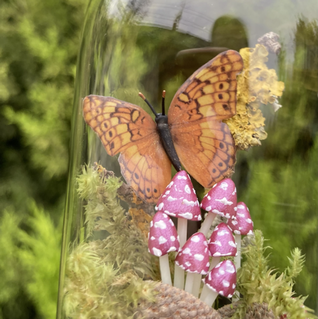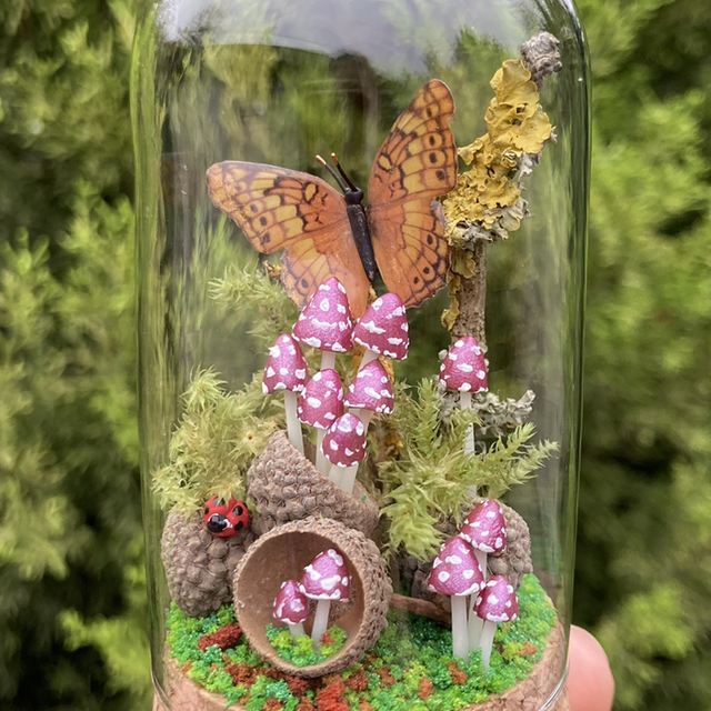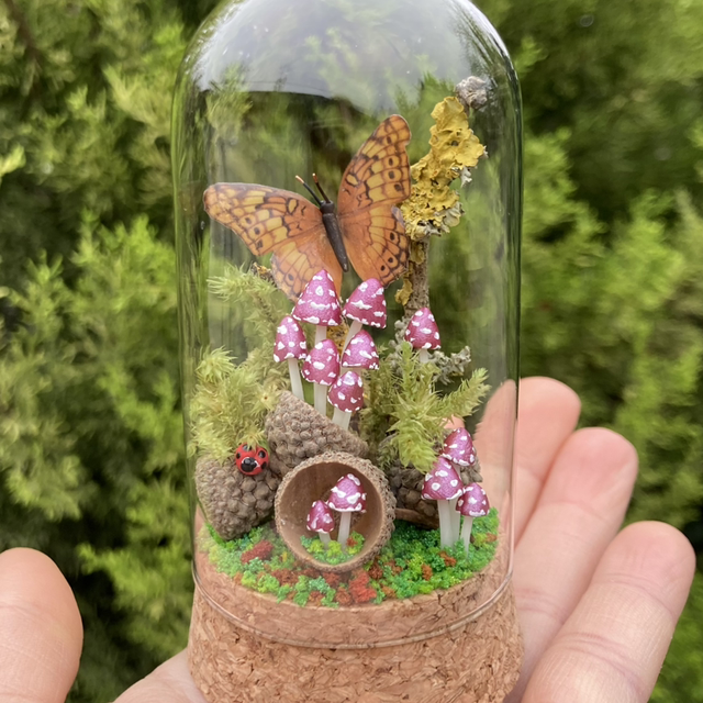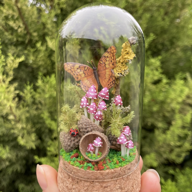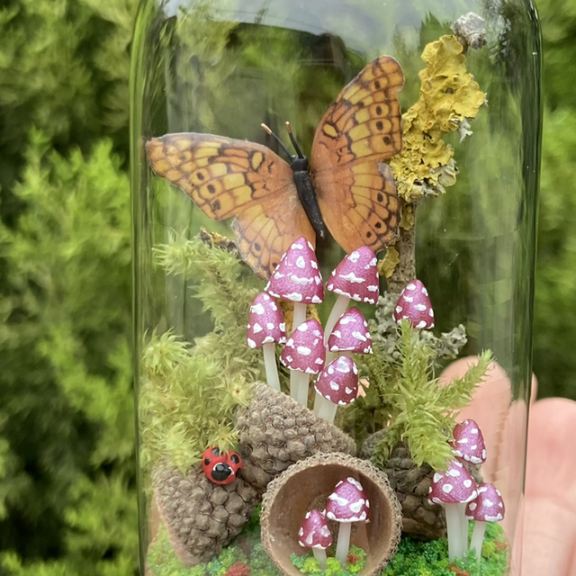 Composition forestière associant des champignons et autres fantaisies sculptées à de véritables éléments naturels, protégés dans un bocal ou sous un dôme en verre.