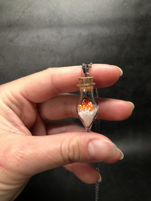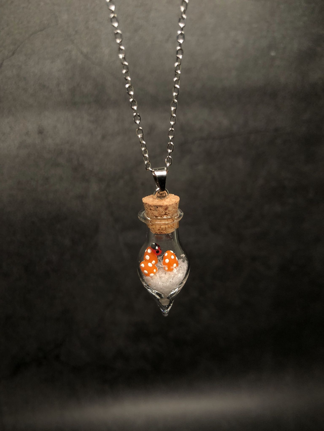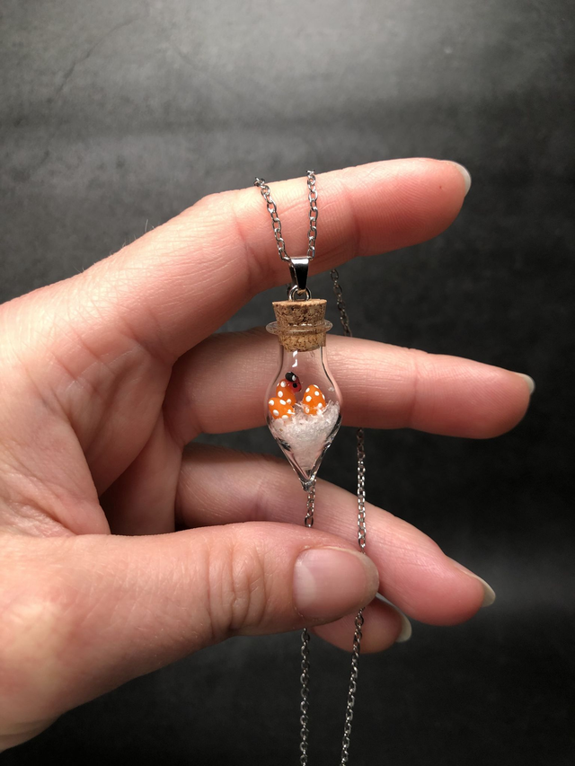 Bijou pendentif inspiré de la nature qui unit des champignons miniatures sculptés à la main en porcelaine froide et autres fantaisies à de véritables éléments naturels, protégés dans une fiole en verre.