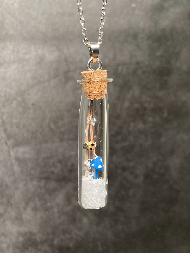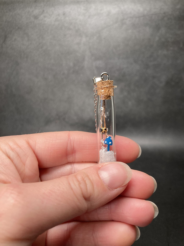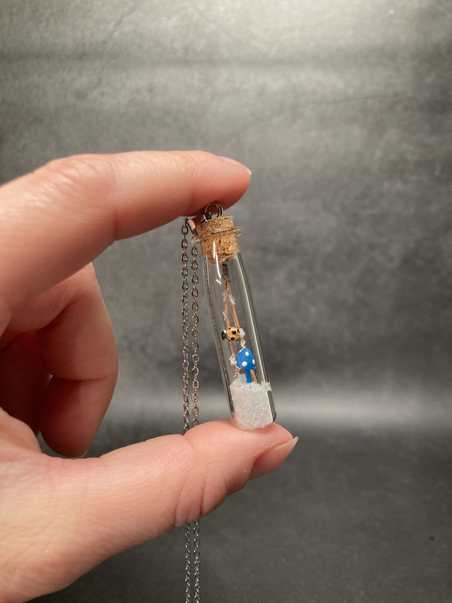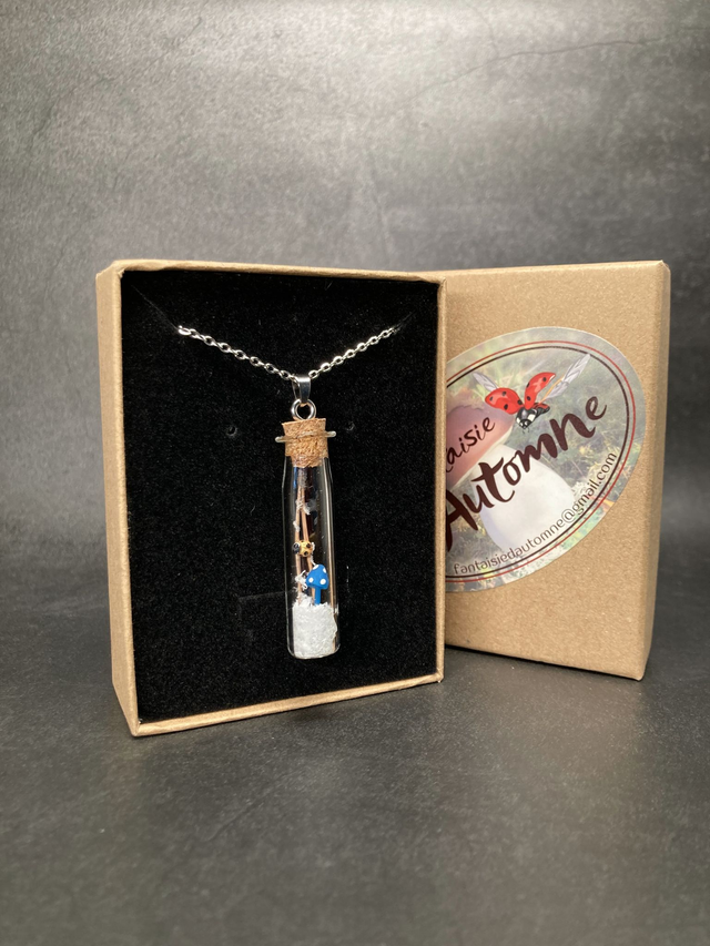 Bijou pendentif inspiré de la nature qui unit des champignons et une coccinelle sculpté à la main à de véritables éléments naturels, protégés dans une fiole en verre.