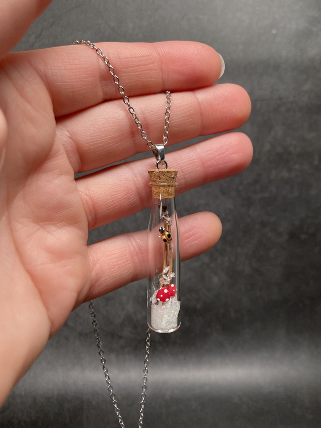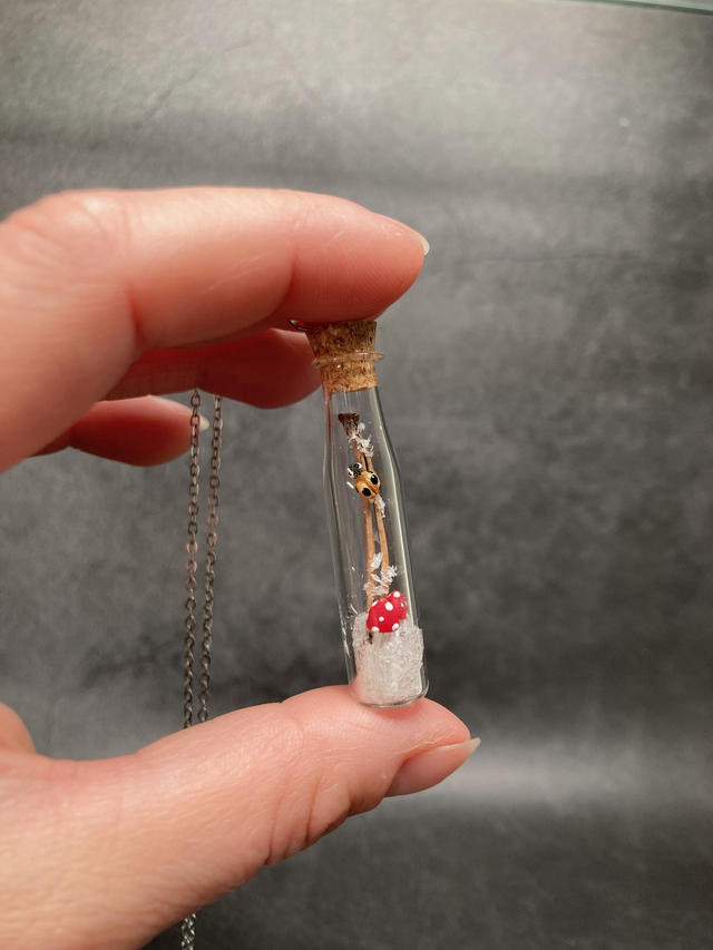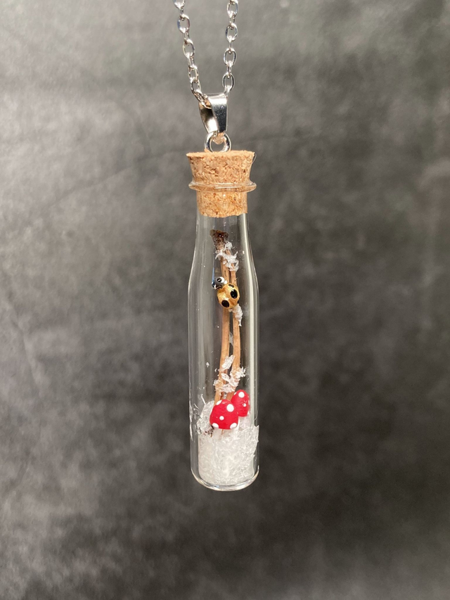 Bijou pendentif inspiré de la nature qui unit des champignons miniatures sculptés à la main en porcelaine froide et autres fantaisies à de véritables éléments naturels, protégés dans une fiole en verre.