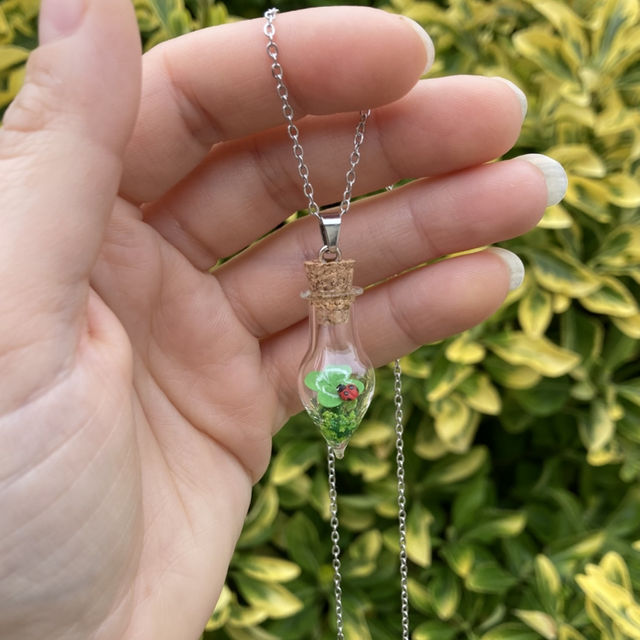 Bijou pendentif inspiré de la nature qui uni un délicat trèfle à quatre feuilles et une coccinelle miniature, sculptés à la main, protégés dans une bouteille en verre.