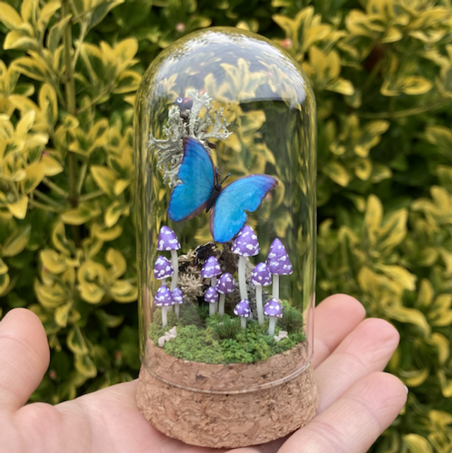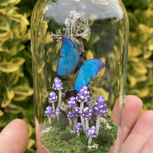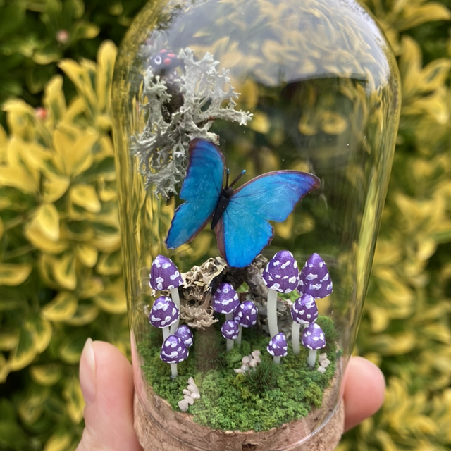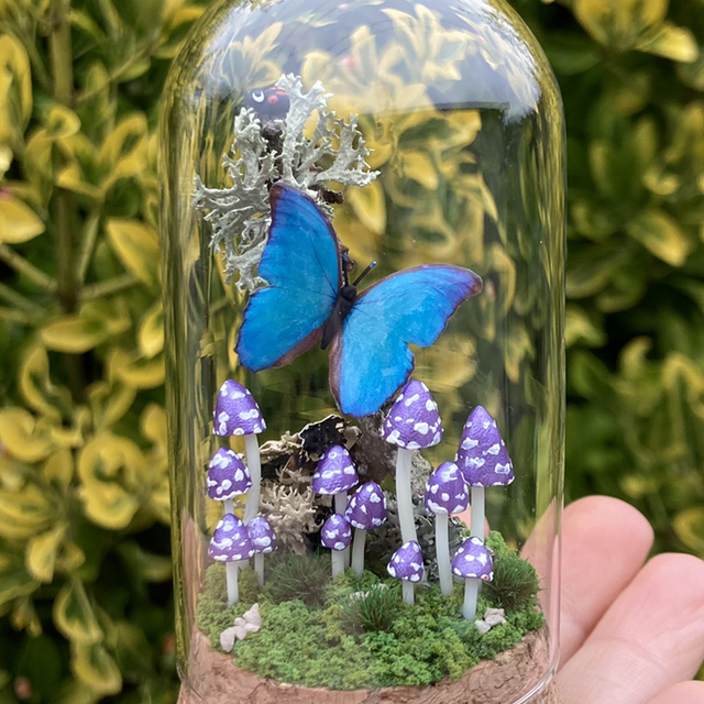 Composition forestière associant des champignons et autres fantaisies sculptées à de véritables éléments naturels, protégés dans un bocal ou sous un dôme en verre.