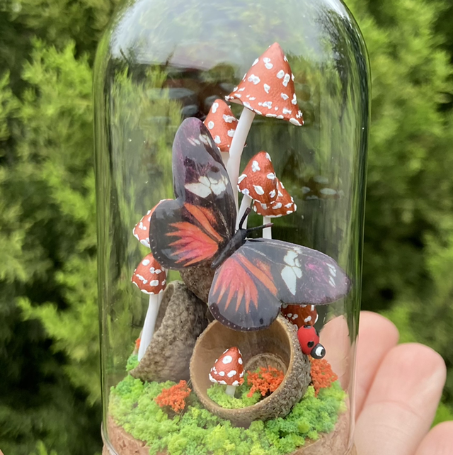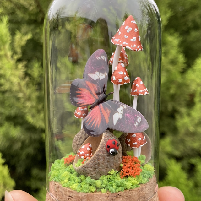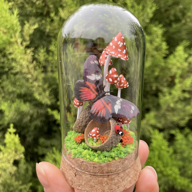 Composition forestière associant des champignons et autres fantaisies sculptées à de véritables éléments naturels, protégés dans un bocal ou sous un dôme en verre.