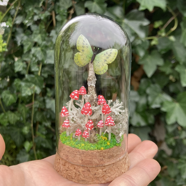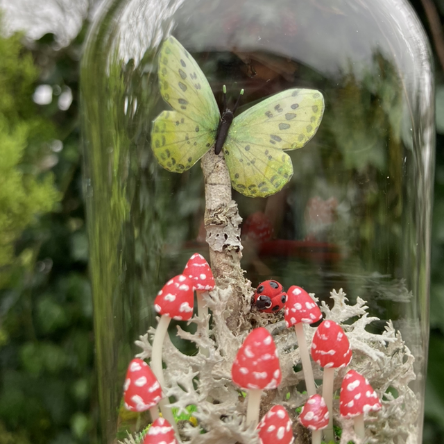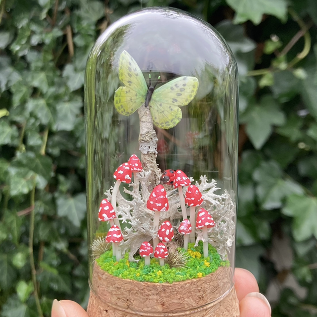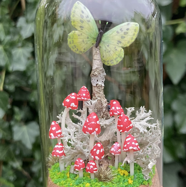 Composition forestière associant des champignons et autres fantaisies sculptées à de véritables éléments naturels, protégés dans un bocal ou sous un dôme en verre.